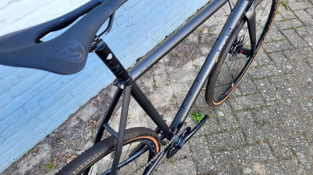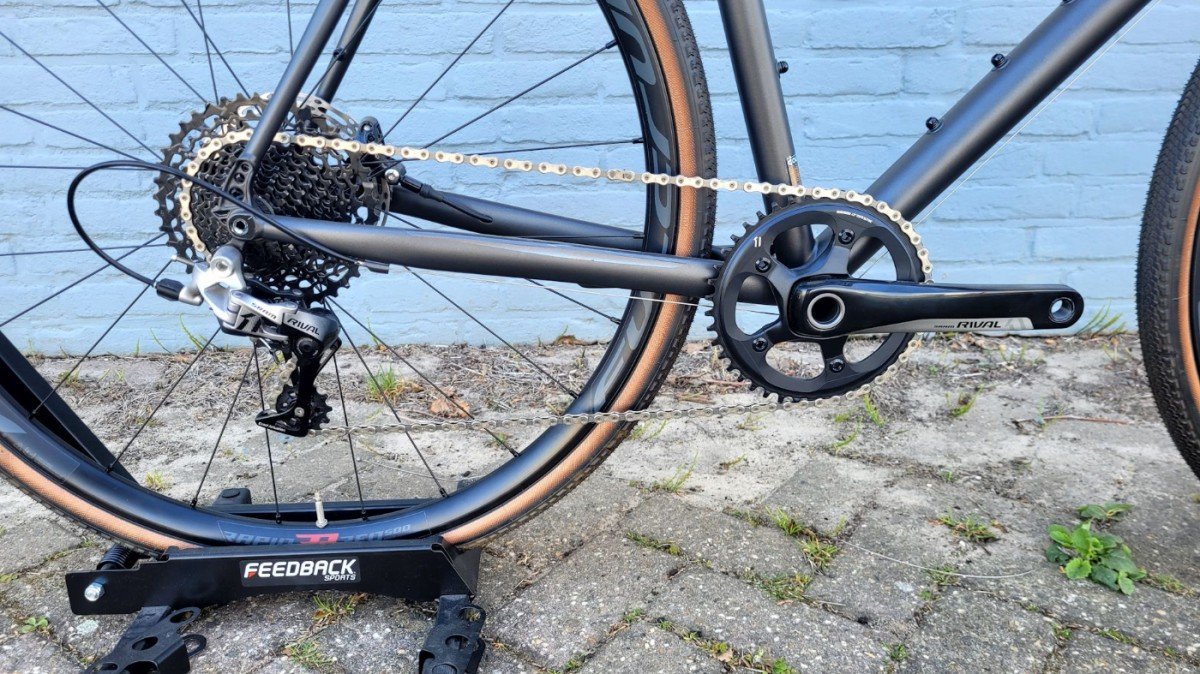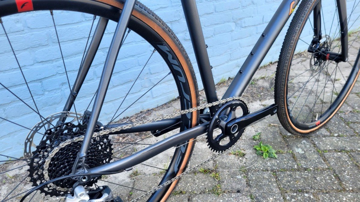 Deze versie van de Nemo Tig Gravel is afgemonteerd met de 12-speed SRAM Rival groep (met een voorblad).